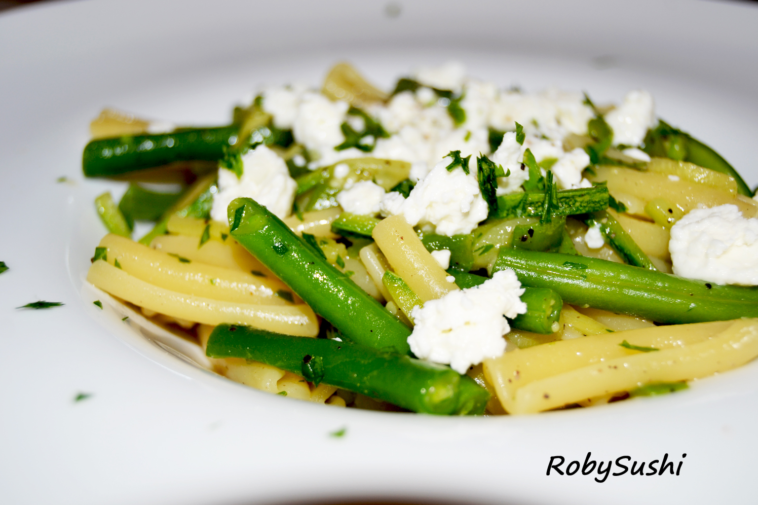 - Unite i fagiolini al resto del condimento e saltate in padella. Scolate la pasta e fatela cuocere due minuti in padella con il sugo. Impiattate e mettete sopra la feta sbriciolata e il prezzemolo.