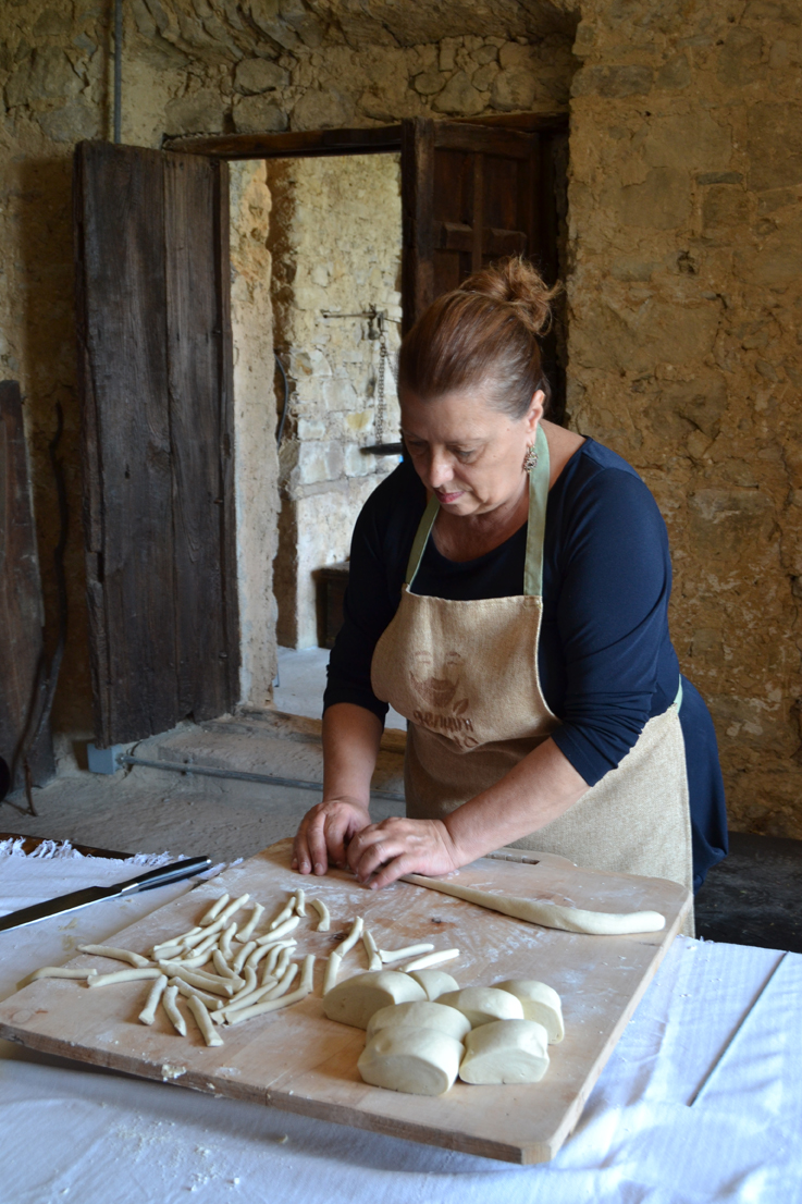 Ecco, inizierei col dirvi che non è stato un semplice corso di cucina. Carmela è un concentrato di sapienza, storia e bravura e ci ha incantati con i suoi racconti sulla cucina cilentana e i suoi piatti tipici, sulle storie e gli aneddoti nascosti dietro ad ognuno di essi, insomma è stato un vero e proprio viaggio nel viaggio. Un racconto di tradizioni passate e di un o stile di vita che ancora si conserva intatto tra gli abitanti di questa terra, il tutto contornato dall’atmosfera di unione e convivialità che solo il cucinare insieme e la tavola sanno regalare. Ci siamo anche dati da fare in cucina, sia chiaro, ma va da se che con la ‘prova forchetta’ abbiamo dato il meglio di noi.