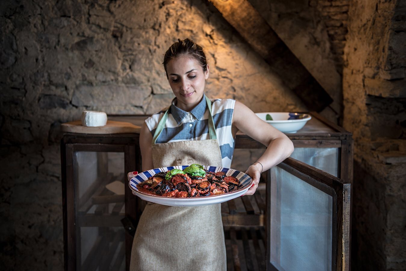 Ed eccoci insieme alla meravigliosa Carmela Bavigli nella cucina di Palazzo Mazzarella, pronti a mettere le mani in pasta e a cogliere quanto più ci è possibile sulla cucina antica cilentana e sulla dieta mediterranea. Il programma culinario? Preparazione di melanzane ‘mbuttunate, fusiddi cilentani, ciambotta primaverile e cavatelli (di cui a breve vi darò tutte le ricette)….non male vero?! No, ve lo garantisco io che ho assaggiato, anzi ‘spizzicato’ (#parevero!) tutto. Neanche a dirlo, tutte le preparazioni sono state fatte con prodotti autoctoni di primissima qualità: la passata di pomodoro fatta in casa con pomodori del posto, il cacioricotta cilentano (presidio Slow Food), le farine di grani locali macinate a pietra, l’olio extra vergine d’oliva del Cilento, le verdure coltivate in loco…insomma, abbiamo rispettato uno dei principi fondamentali della dieta mediterranea, ovvero quello di seguire un’alimentazione variegata, utilizzando soltanto prodotti di qualità, di cui si conosce la provenienza e coltivati rispettando le stagioni e il territorio.