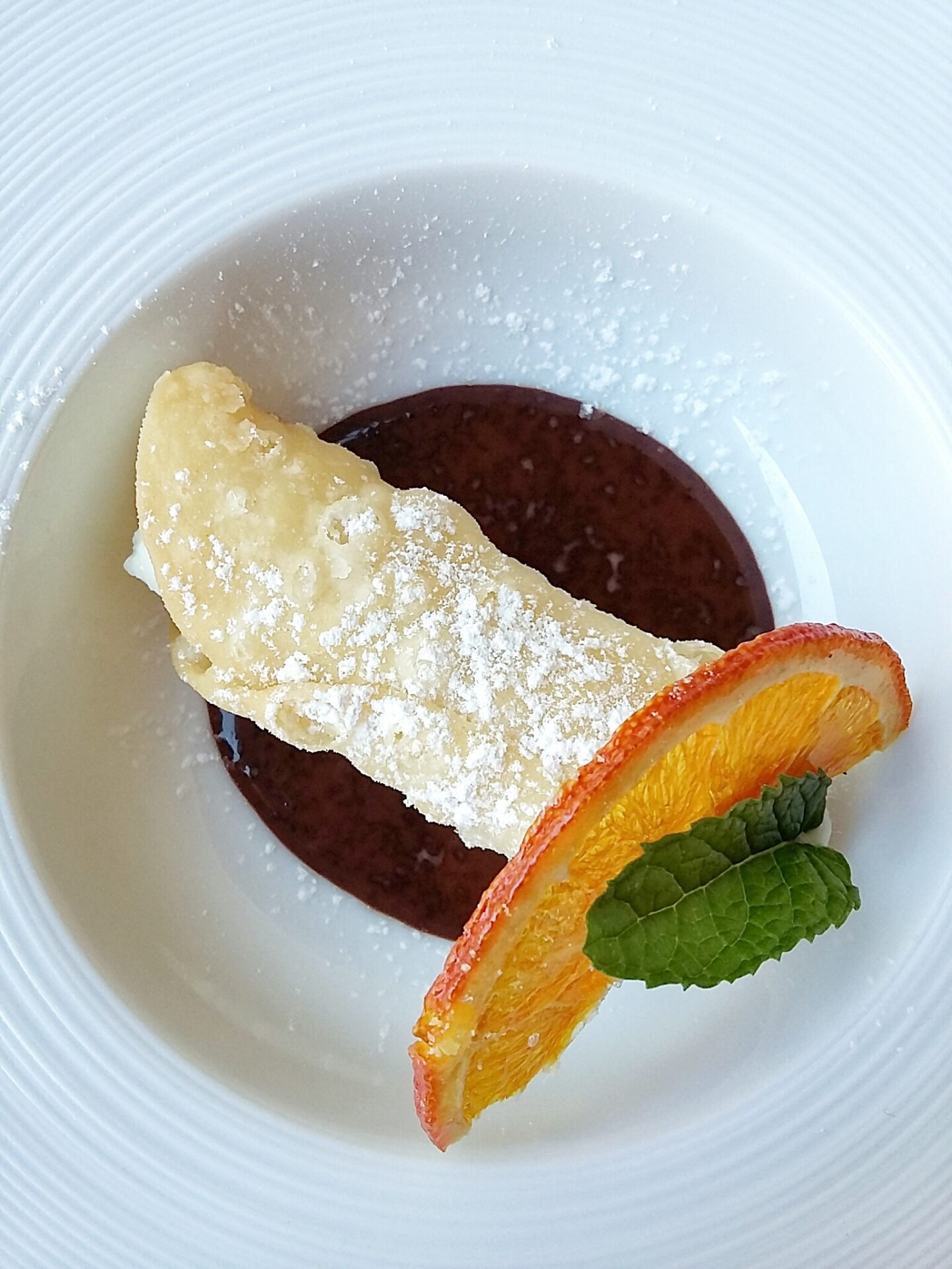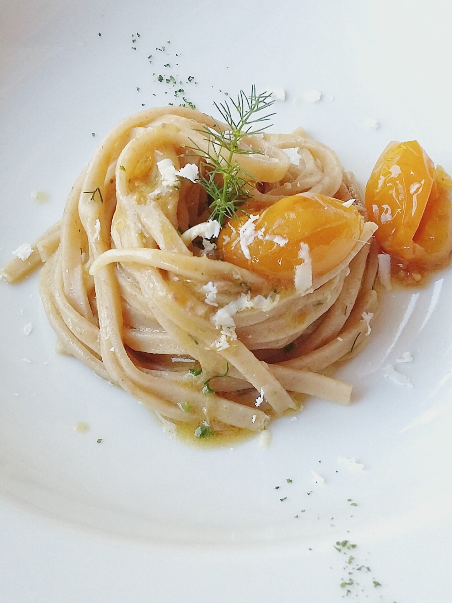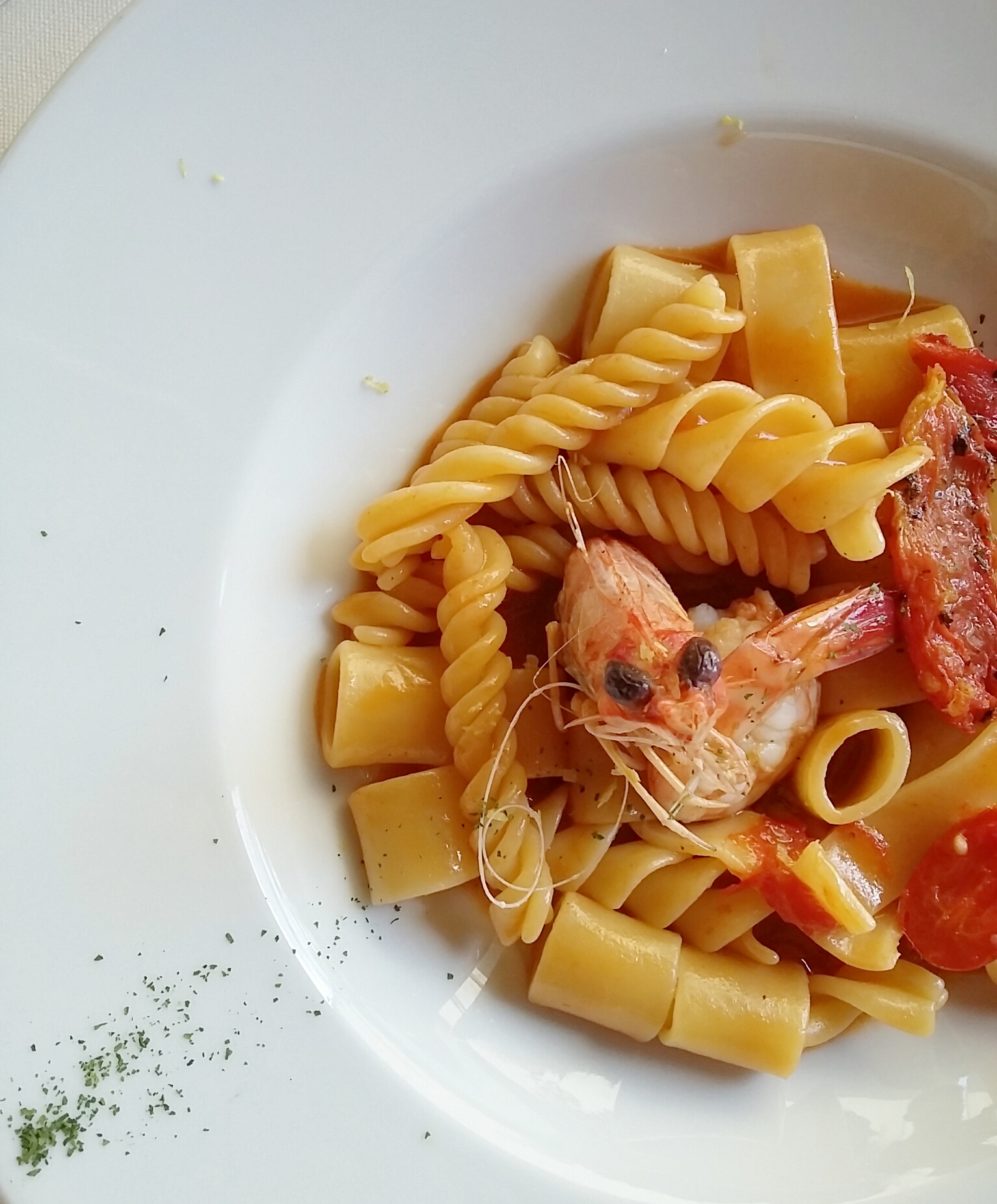 Eccovi accontentati! Alici marinate solo nel limone con finocchietto selvatico, gamberi rossi marinati in succo di limone a arancia su letto di patate, pepe rosa in grani con arancia candita e sablè di acciughe, zuppetta di minestra cilentana con quinoa e polpettine di acciughe, fettuccine di farro farro a mano con pomodorino giallo, alici di menaica cacioricotta cilentano mentuccia e finocchietto, pasta mista con sugo di pesce, involtino di sgombro con quenelle di patate e menta su pure di fave, e per concludere…cannolo cilentano con crema di ricotta pere e cioccolato. Se solo ripenso all’intensità di tutti questi sapori ho di nuovo fame!