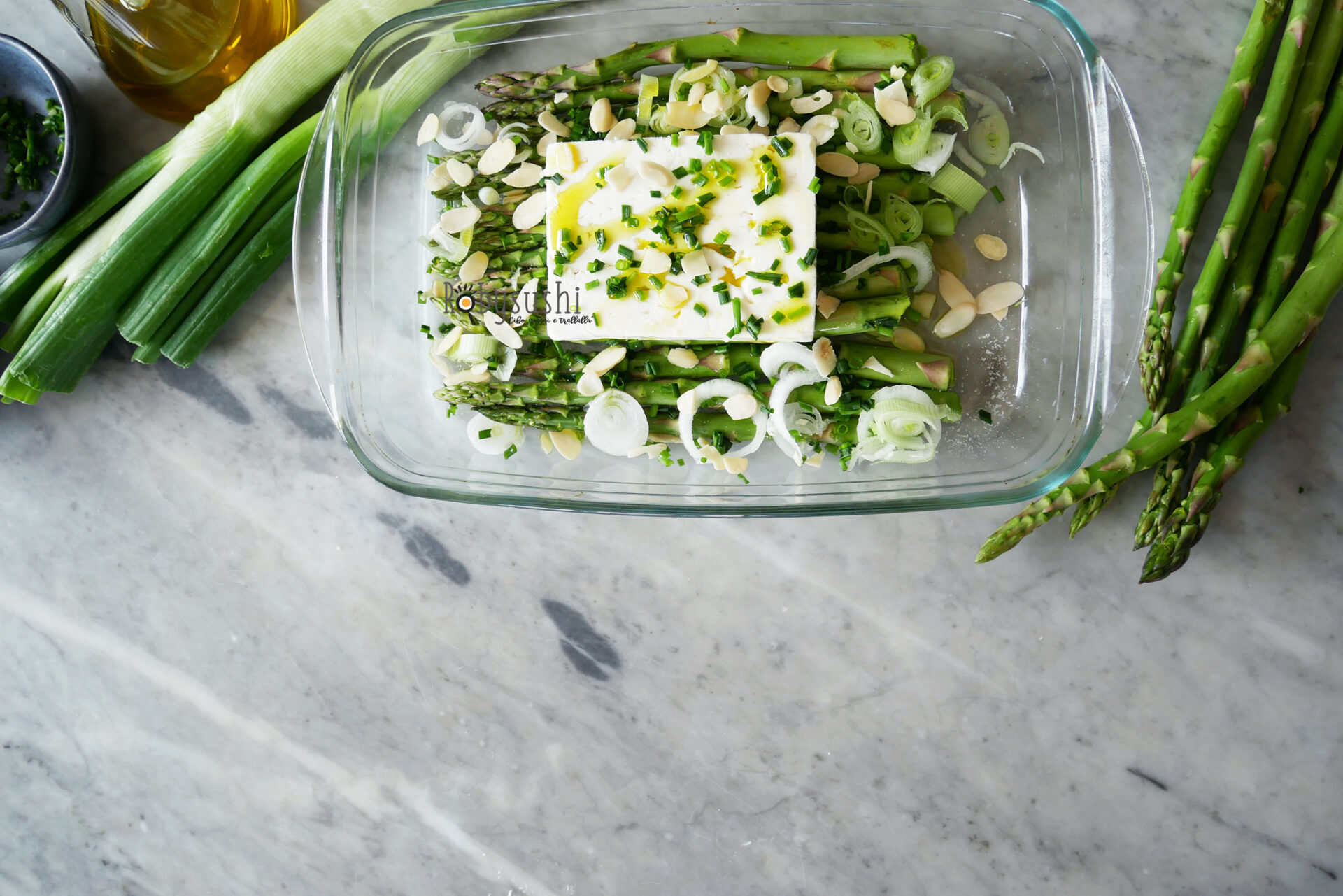 Primavera significa: trovare finalmente gli asparagi sui banchi del mercato! E voi non avete idea di quanto io li adori, quindi preparatevi all’arrivo di una serie di ricette a base di asparagi nei prossimi giorni. Sul blog ce ne sono già una gran quantità, ma secondo me non sono mai abbastanza, quindi ne arriveranno delle nuove, come quella di oggi: feta al forno con asparagi cipollotto e mandorle.