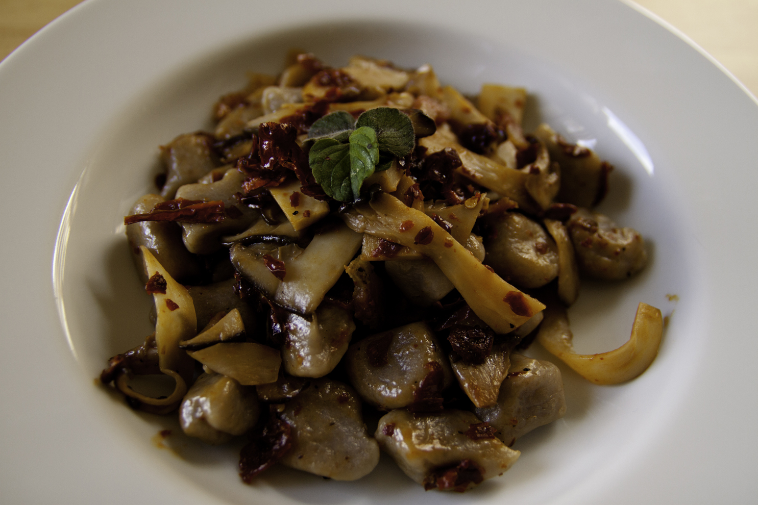 - Con la schiumarola, mettete gli gnocchi nella padella con i funghi, per poi sbriciolarvi sopra, con le mani, i peperoni cruschi. Saltate per un minuto, aggiungendo un po’ d’acqua di cottura degli gnocchi se troppo asciutti. Servite quindi, aggiungendo qualche fogliolina di mentuccia direttamente nei piatti. E buon appetito!