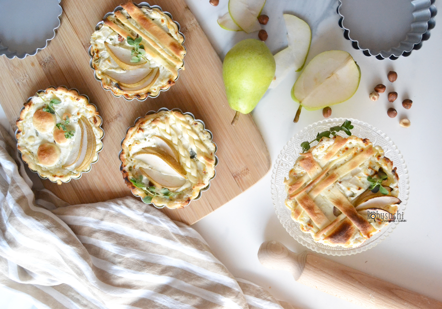 5 ingredienti, 5 mosse, una ricetta: torte salate con caprino, pere, nocciole e maggiorana