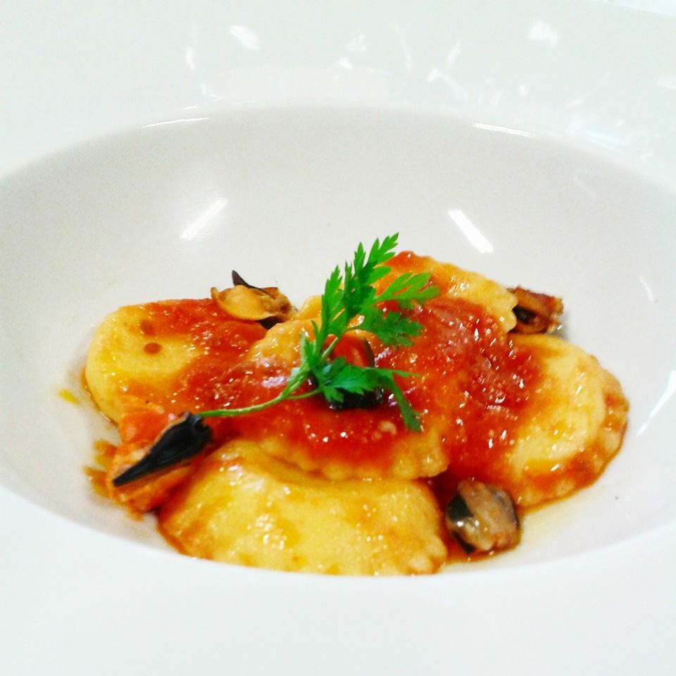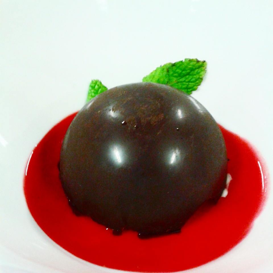 I ragazzi ci servono un sushi di baccalà con peperoni arrosto, originale e divertente, seguito da ravioli di bufala all’arrabbiata, dal sapore deciso e intenso anche se leggermente troppo sapidi ma perfettamente stemperati dal Riesling in accompagnamento. Il secondo, un trancio di ombrina con brodo di provola e gelato ai piselli è decisamente il piatto forte della giornata insieme alla crème brulée alla liquirizia. Per concludere una meravigliosa cupola a sorpresa.